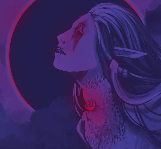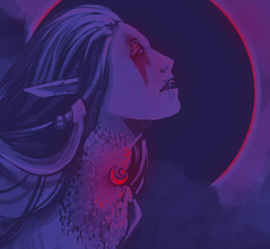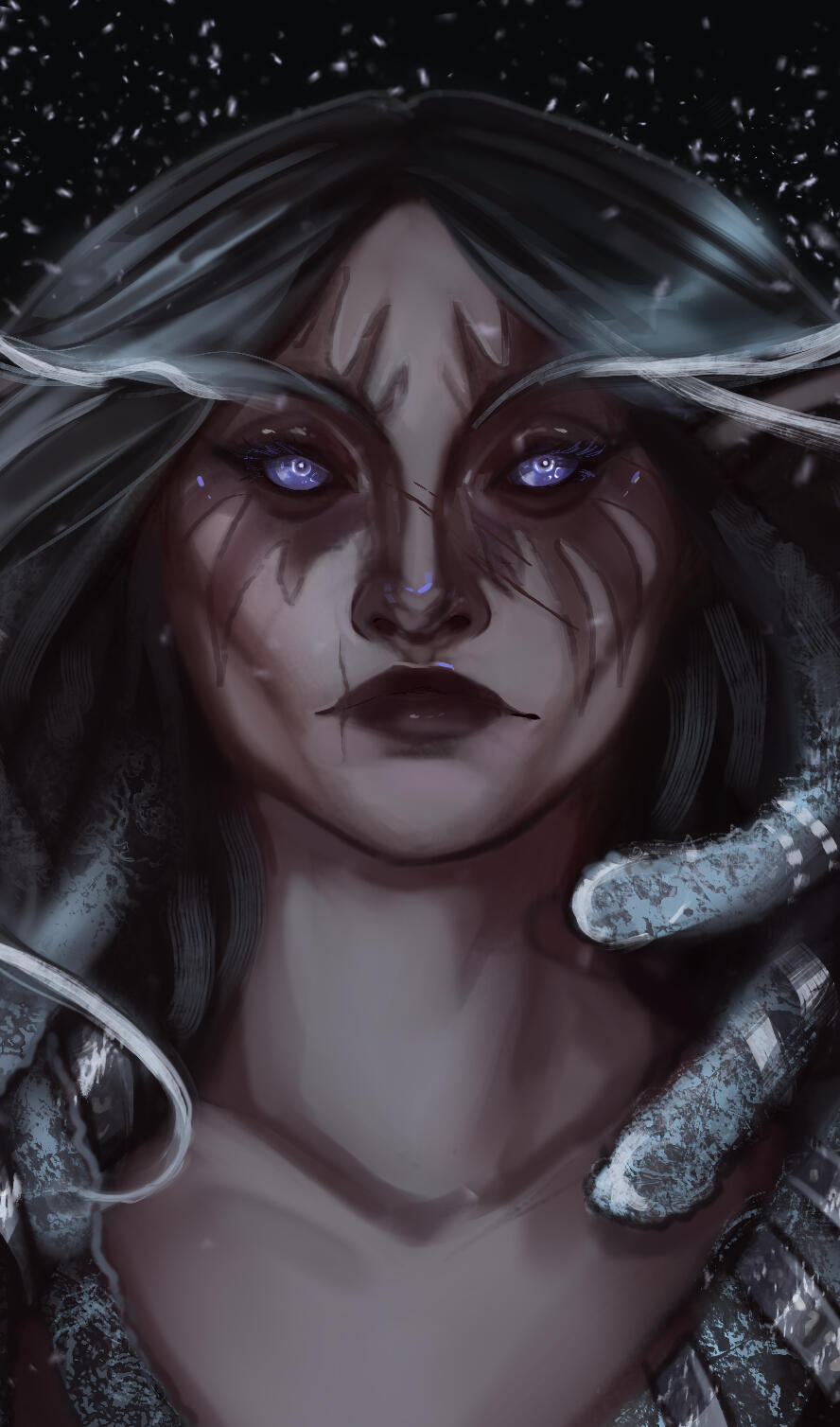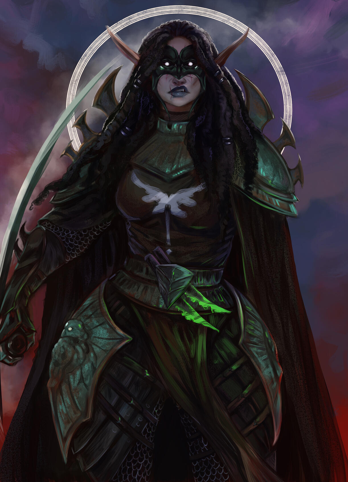 A scar that mimics a claw mark stretches from her right eyebrow down to below her cheekbone. Another that is visible with her mask in place runs the right side of her face, cutting through her lip and disappears beneath her armour.Her dark hair hangs loose and wild around her shoulders, various trinkets and jewellery attached to the dreads. Most notable ia a small braid that hangs just behind her right ear where a greyish-blue owl feather is attached by a small iron clasp. Above this clasp is a newer addition, it's silver gleaming bright against the worn iron below. A warden owl identical to her companion, Kal'dris, sits perched on the inside of an Umbral Glaive gripped by his talons which frames around his figure. Fine, delicate craftsmanship.If one was to see Callean unarmoured they would notice that her back and upper arms are covered in intricate runic tattoos. Each holding the symbol of her rise in rank within the Shadowleaf Watchers.