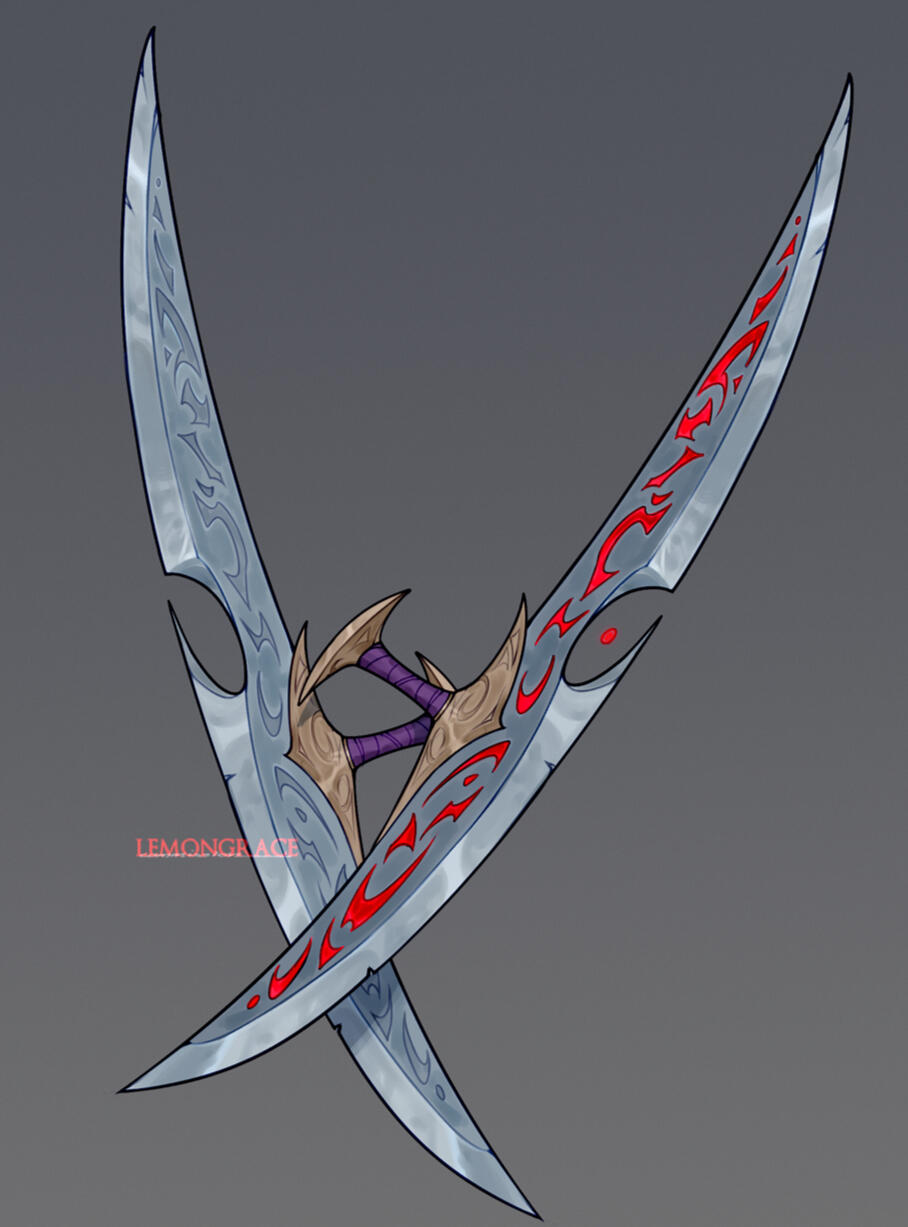The infamous blades of her Predecessor's are an oddity amoung Kaldorei weapons. The glaives themselves look as if they would have been considered ancient even in the time before the sundering. The glaives while sleek and perfectly balanced, as one would expect Kaldorei weapons to be, have old (some would even consider crude) runes scribed along the length. What they mean has been lost to time but it is obvious they have been placed there with intent and consideration.If one were to look closer or have an affiity for sensing magic, they would notice something unsettling about them. The shadows seem drawn to the weapons, clinging to the edge and slithering over the blades independent of their surroundings. Those who are particulary sensitive would know something is not quite right, an almost malevolent energy seems to be emitted by them.RunesWhen at ease the runes themself are docile and blend almost into the metal unseen. Once engaged in battle they burn a bright dark red.