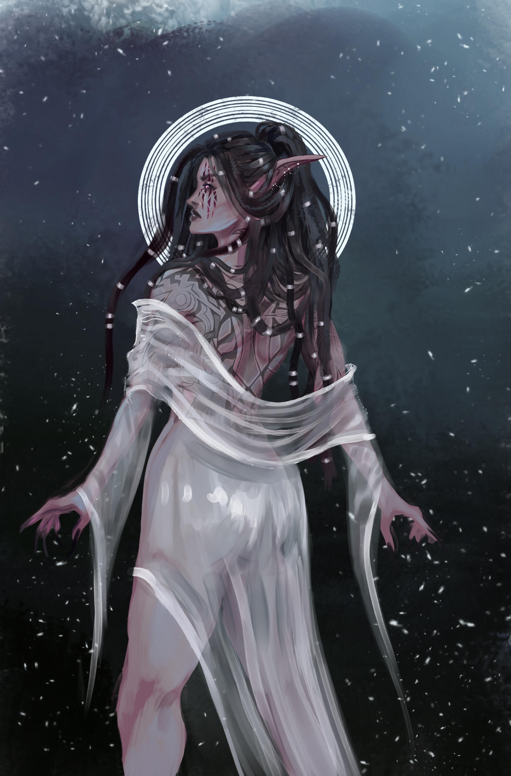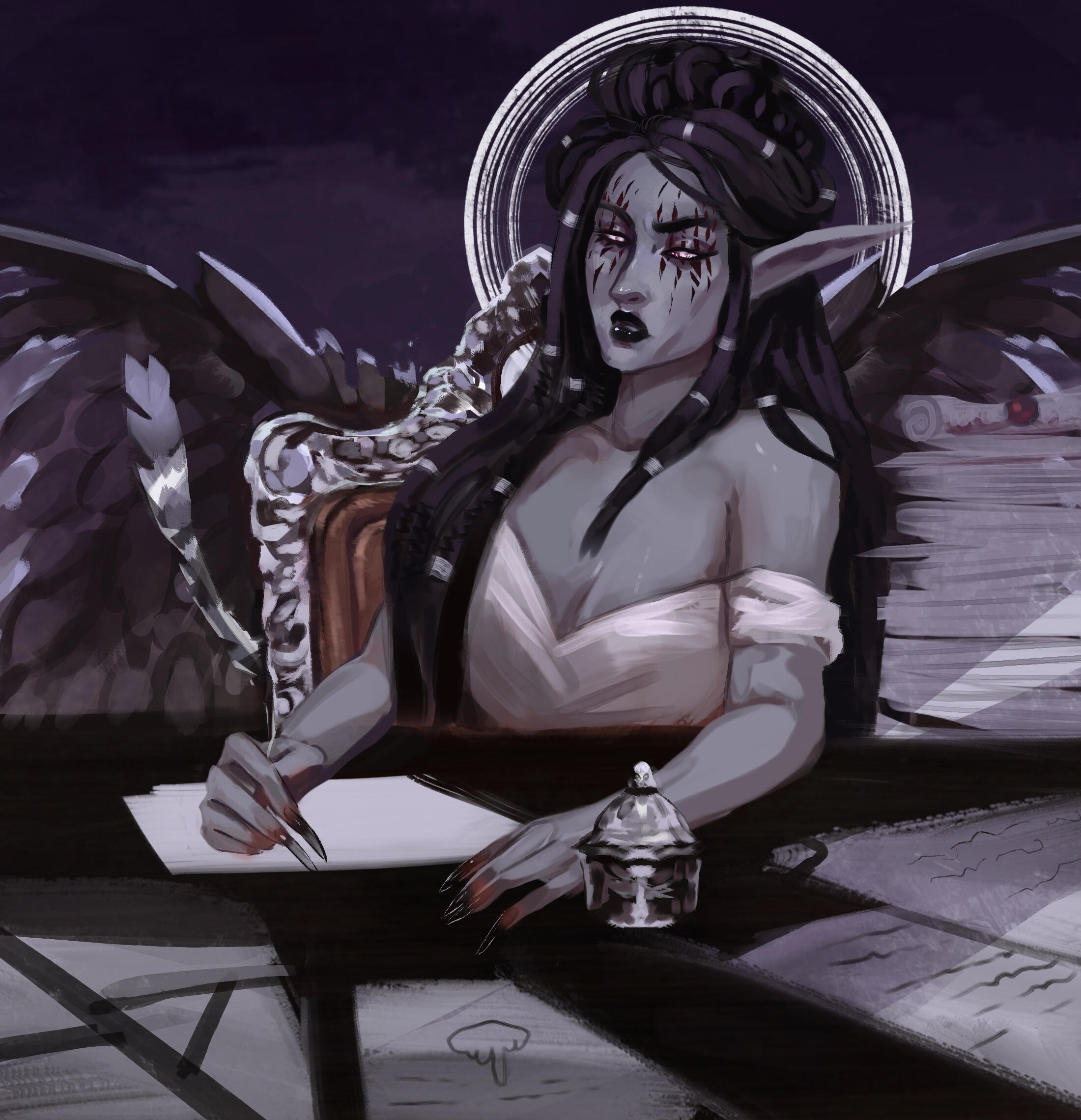 A scar that mimics a claw mark stretches from her right eyebrow down to below her cheekbone. Another that is visible with her mask in place runs the right side of her face, cutting through her lip and disappears beneath her armour.Her dark hair hangs loose and wild around her shoulders, various trinkets and jewellery attached to the dreads. Most notable ia a small braid that hangs just behind her right ear where a greyish-blue owl feather is attached by a small iron clasp. Above this clasp is a newer addition, it's silver gleaming bright against the worn iron below. A warden owl identical to her companion, Kal'dris, sits perched on the inside of an Umbral Glaive gripped by his talons which frames around his figure. Fine, delicate craftsmanship.If one was to see Callean unarmoured they would notice that her back and upper arms are covered in intricate runic tattoos. Each holding the symbol of her rise in rank within the Shadowleaf Watchers.